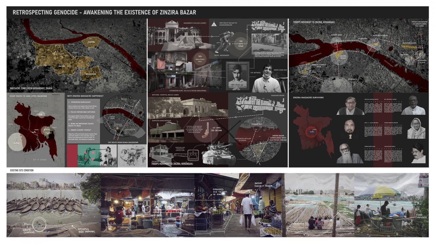 Three million people were ruthlessly killed in Bangladesh during the liberation war in 1971, however, the genocide is still not recognized globally. The Pakistani militants and their local collaborators systematically spirited people away, killed, and dumped dead bodies in either the killing site or separate mass graves. These killing sites, mass graves, and torture cells are disseminated around the country. Unfortunately, there was little visual documentation of these atrocities as foreign journalists or reporters were forced to leave the country right before the massacre and the prominent local reporters were murdered or forced to leave the zone immediately after the crackdown. After independence, only a few major mass graves were conserved, protected, and recognized as historical sites. Through this research, one of the most significant killing sites from Zinzira, Keraniganj is identified and found as a probable space of massacre to create a memorial journey that would be a reminder of the tragic past- balancing the existing functions of the site which is a large-scale Bazar; thus creating harmony between the subsisting programs and the history.