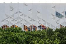 The facade construction is made from prefabricated white concrete on metal frames, the material allows minimal maintenance and being a designed piece allows the least number of adjustments in placement.