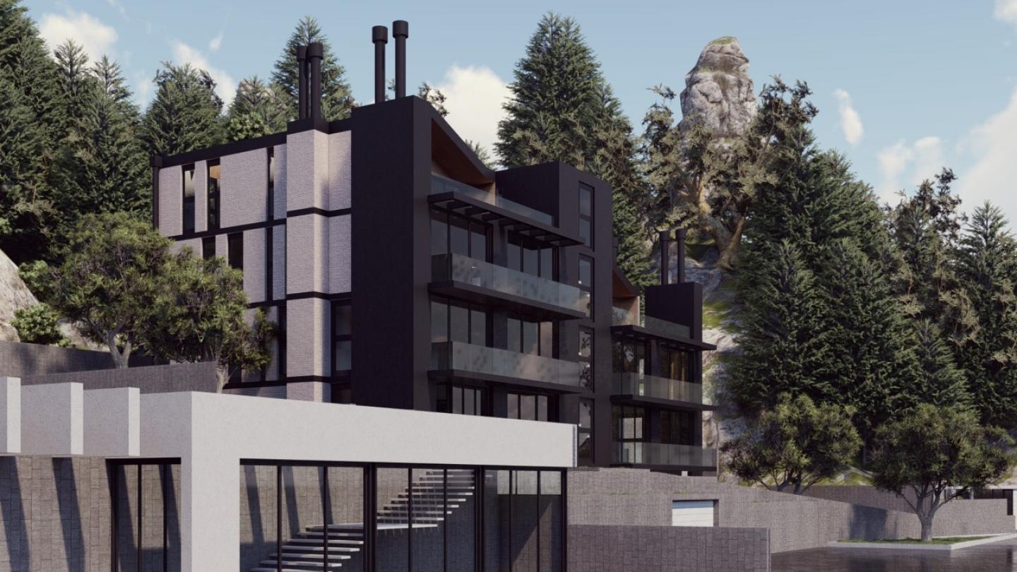 Two blocks integrated in a rocky hill, linked by a circulation core. The view towards the valley is oriented south, thus the elevation consists of big opening, and the volumetric is terraced like the plot, creating the amalgam between bigger and smaller sizes apartments.