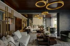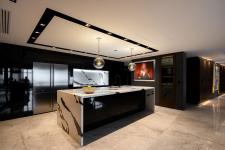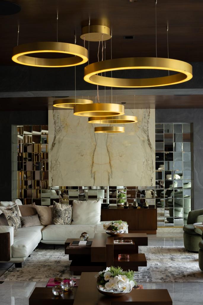El juego entre los mármoles blanco y negro con las tonalidades neutras de la paleta de color, reciben los acentos de los diferentes elementos dorados y los atractivos luminarios suspendidos. En las recámaras se utilizó papel tapiz en algunos muros para enfatizar la calidez necesaria para las zonas privadas y el confort acústico.