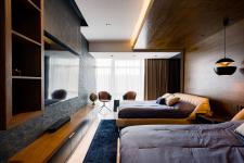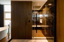 The match between the black and white marbles with the neutral shades of the color palette, greet the different accents of the golden elements as well as the attractive suspended lamps. In the bedrooms wallpaper was used to emphasize the necessary warmth for the private zones as well as acoustic comfort.