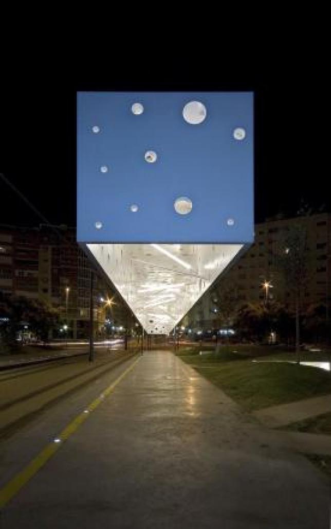 At night they turn into two powerful lamps which directly illuminate the platform. The benches are placed linked to the ways, and they allow travellers to wait the tramway while they keep contact with vegetation, giving a smooth light to the path.