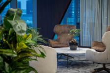 The office design emphasizes the status of the company, conveys a special modern elegant chic and attracts the attention of guests and sticks in their memory. A reference to a luxury yacht is felt through premium wood, gilded decorative details and fancy upholstered furniture in the interior. The secular cruise atmosphere is also inspired by glass elements and curved shapes, similar to the smooth waves of the sea. The space is full of pots with lush plants that recreate the feeling of an oasis near the sea coast.