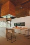 On the other hand, all the glass in the house has been renewed, both in the windows and in the upper parts of the partitions. In the day area, the two curved wooden volumes, which hide the kitchen and the study area, do not touch the roof. For this purpose, transparent glass was installed to replace the existing brown ones to separate the areas acoustically and allow the outside light to enter. With this strategic change, the visual perception is that the roof is floating above the house and not lying on these transparent elements.