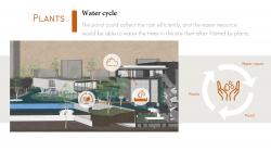 The pond could also be a private water storge tank for the plants in site, creating a water circle by ourselves. The water in the pond evaporates into the air, through condensation and precipitation then back into the pond. Fresh water for soft reflection in the restaurant, then use it for watering after renew the pond. Overall, the water cycle benefits natural environment, both for the surrounding temperature and ecological biodiversity.