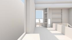 As one walks through they enter the gallery which has a double level zone and a single level zone where the paintings are hung. The natural light entering through the sky light is always providing light to the space in an indirect way to avoid damage to the paintings.