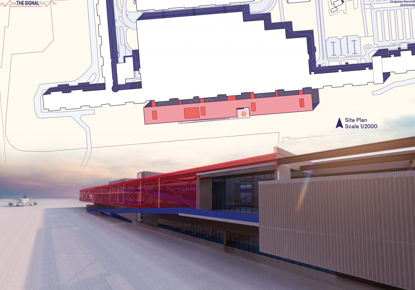 The Signal is structurally attached to a disused airport in Turkey. With its own structural structure, it provides the chance to create both strong and flexible spaces by using the existing structure of the airport. In addition, the airport features and the runway become usable.