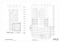 Level 6 TO 9: These levels have 313.65 m2 each (1254.60 m2 in total) divided into 5 apartments, 2 with 2 bedrooms and 3 with 1 bedroom. It has a lobby, vertical circulation modules, 1 module for emergency stands and two elevators, ducts for installations, 1 storage room and bathroom for service.