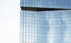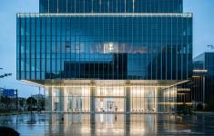 The vertical curtain wall system perfectly presents a simple and candid design. The vertical metal louvres minimise glare and at the same time play the role of shading and energy saving. The glass curtain wall with 15% reflectivity brings the outdoor scenery into the room and achieves an organic integration of the façade and nature. The high-ceiling design on the first floor is matched with ultra-white Low-E glass to form a visual contrast with the upper tower under the night light, creating a bright and elegant arrival experience.