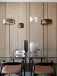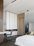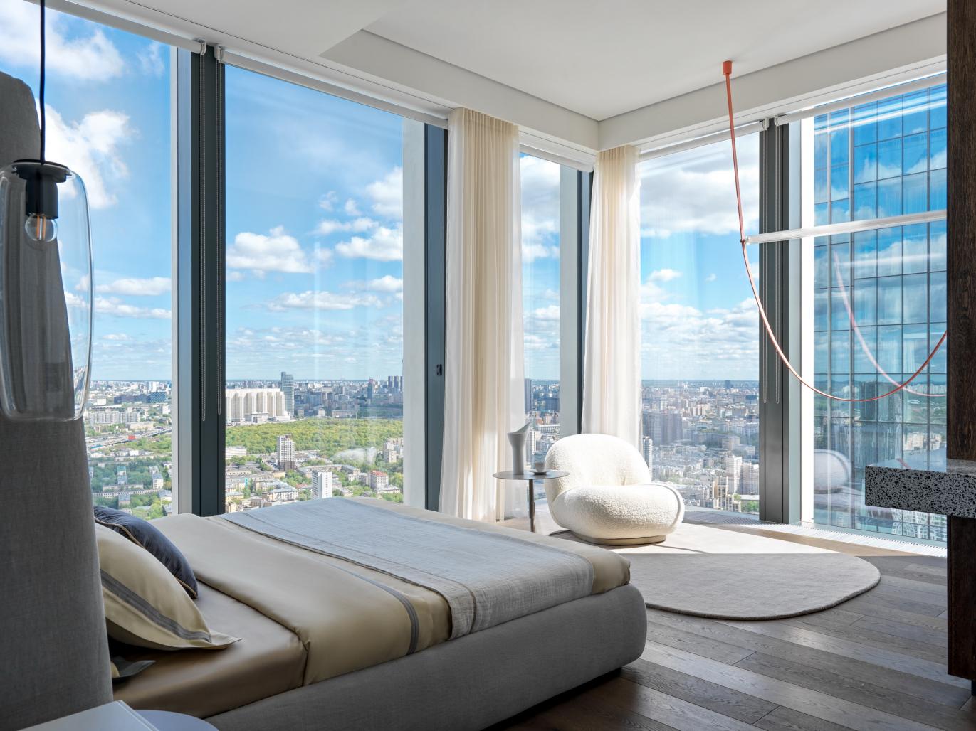 The bedroom space is spectacular in itself due to the corner windows. The authors emphasized the view outside the window with the arc of the Flos pendant lamp, added comfort due to the armchair in a fashionable boucle finish. A tactile floor board made of dark oak, a hanging table made of actual terrazzo, textiles and fabrics assembled in a complex beige range of colors are combined here in a memorable image, dynamic and at the same time cozy. The gradient painting behind the headboard echoes the setting sun.