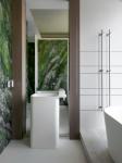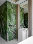 The bathroom is most brightly decorated. A free—standing designer bathtub was placed right next to the window, and large-format porcelain stoneware of a rich green color, reminiscent of a tropical jungle, was placed on the walls. The elegance of the bathroom is emphasized by a podium with lighting, behind which engineering communications are hidden; a floor sink serves as a companion of the bath.