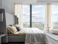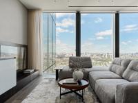 The apartment is located on the 44th floor of a modern skyscraper and is decorated in a contemporary and spectacular style. In the living room, panoramic windows are emphasized by a visually weightless glass table; the walls are decorated with natural oak panels in contrast with the glass. The core of the interior is a wall decorated with glossy coffee-colored panels that turn into a kitchen made according to an individual project. On the next wall, the kitchen is a single composition with the furniture in the living room, and is effectively suspended in the air to create dynamics in the interior.