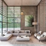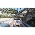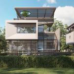 This prototype house should accommodate a young family. A place for living, working, and chilling. To comply with the requirements of the new pandemic. The spaces are divided via the privacy level vertically. It's a split-level villa and it is designed that way to achieve both privacy and open space plans. The journey begins with a group of welcoming steps lying along a pond taking you to the entrance at level 0.60, where you get into a lobby that either takes you upstairs where you find the office at level 1.50, or you go down a couple of steps to the reception and dining area at level -0.30. From the office, you go up a few more steps to reach the living room -overlooking the reception- and the pantry. Then you continue the journey up half a floor to reach the bedrooms. And then the journey ends at the higher level where there is a roof terrace to reach the top of the tree.