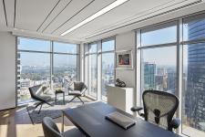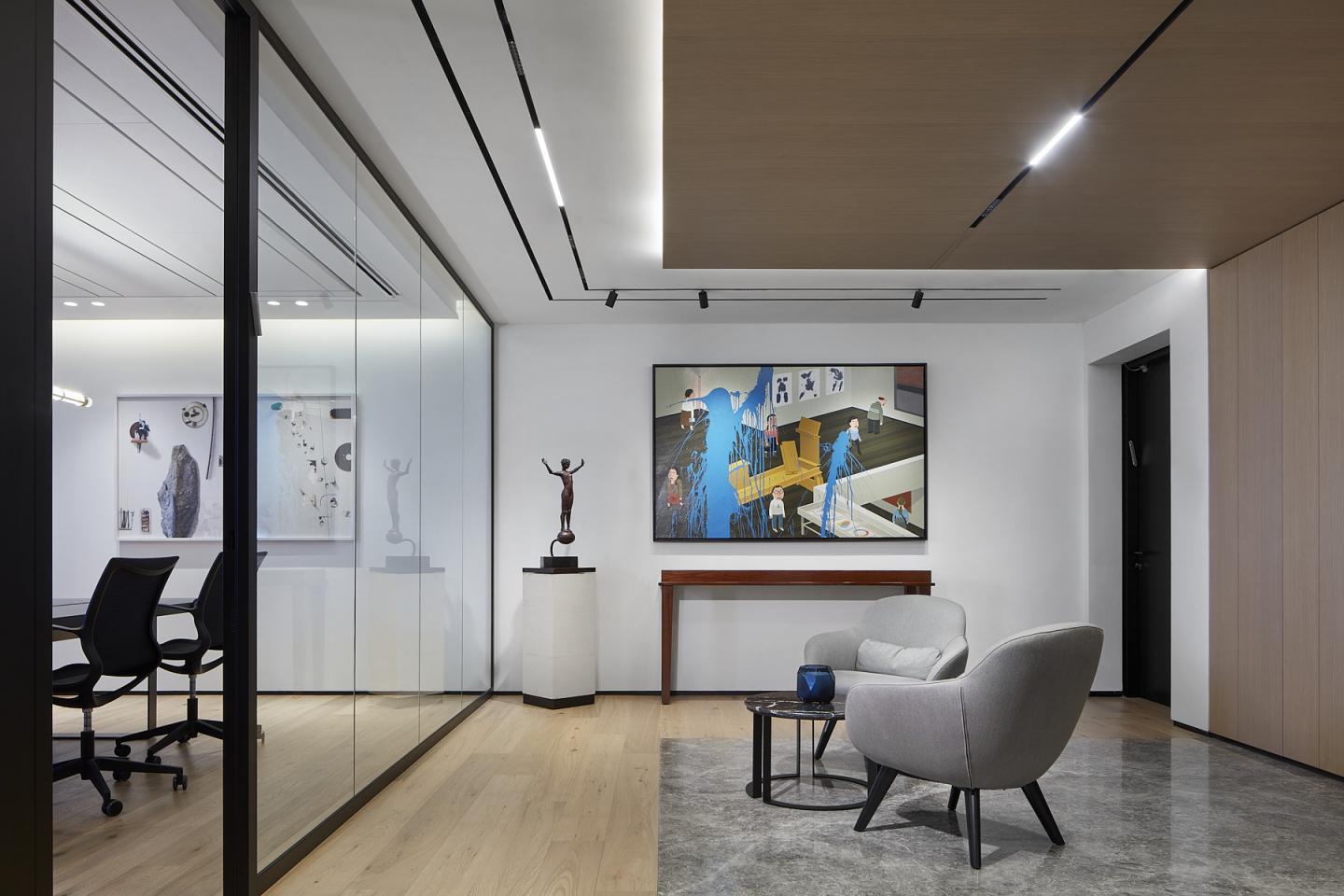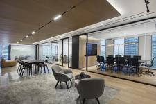 The new offices are located on one of the top floors of an office building, which has recently been refurbished and gained an additional seven stories in the process. According to Zeldman, the planning started with an empty shell: a rectangular space that needed to be “broken up”, lengthwise, for ultimate space planning from the first step on site. All the hosting functions were planned in the spacious central lobby, and the offices and conference rooms enjoy an uninterrupted view of the urban skyline, thanks to Zeldman’s plan to create floor-to-ceiling black aluminum framed glass partitions.