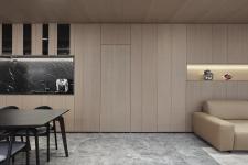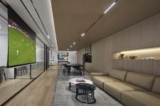 The veneer runs from the marble floors and continues across. Two concealed integral doors were fitted behind the central lobby: one leads to a bathroom with toilets and a shower, and the other leads to an employee kitchen. A coffee niche covered in natural granite stone was created in the lobby, lit by hidden lighting fixtures. Storage space was created above it and a wine cooler was designed within it, as part of the niche. The dining area is made of blackened natural oak and an entertainment system that is revealed with a push of a button was positioned across from a leather sofa. “The space is equipped with all that is required for the ultimate sports game viewing experience”, states Zeldman.