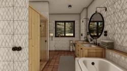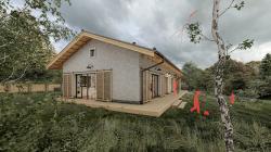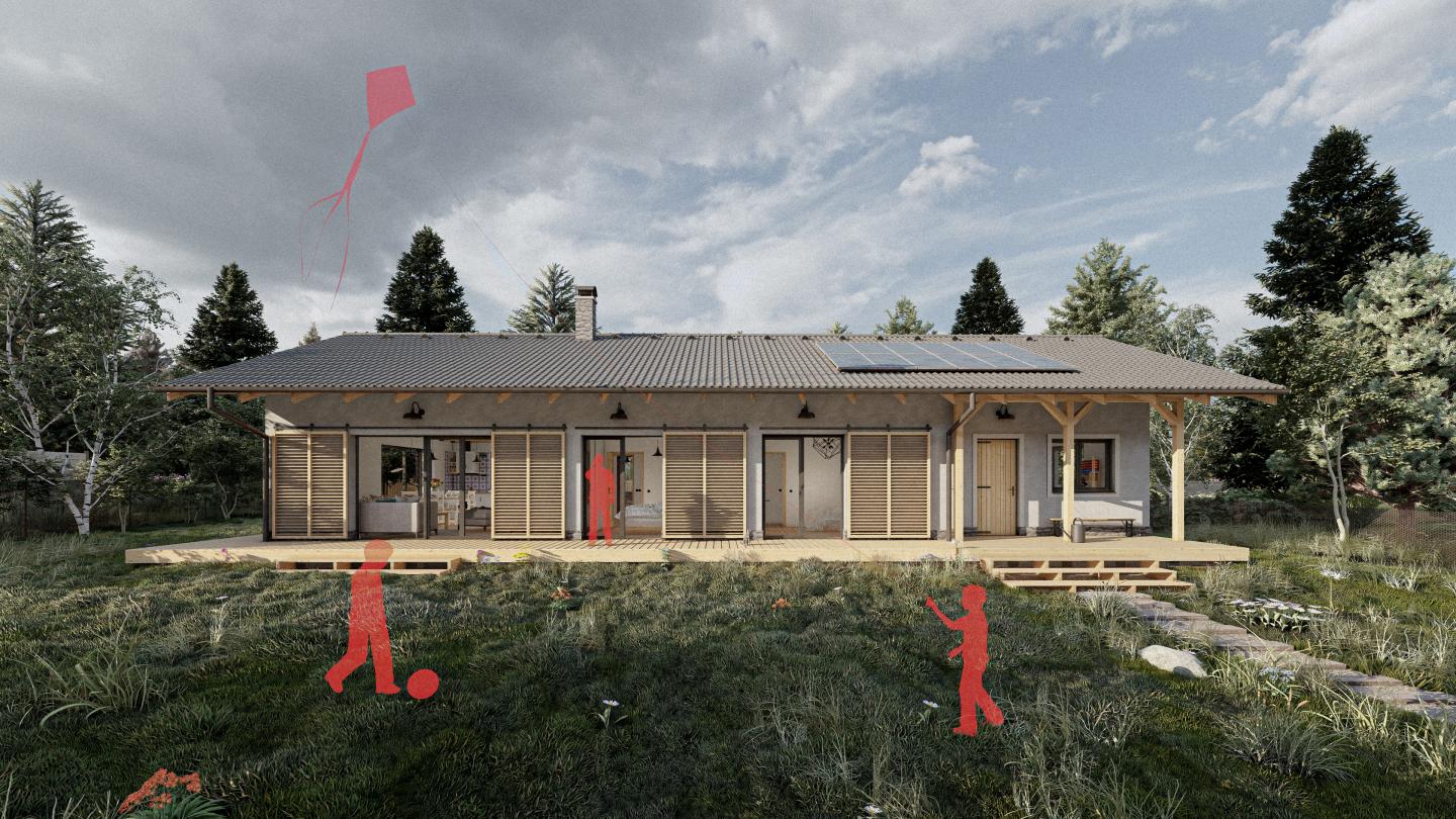 The proposed layout is the result of a search for an operationally functional and legible layout that meets the needs of future users and the energy requirements of the house's operation. The entrance part is defined at the northern border of the plot. The vestibule connects to the central corridor, which optically divides the space into private and social areas. The social part, consisting of a living room with a kitchenette and exit to the garden terrace, is located in the south-western part of the house. The room and bedroom are located on the southern facade, also with access to the terrace. The private part also consists of a room for guests and a bathroom, which is located in the north-eastern part. Both parts are connected by a corridor with hygienic toilet facilities and a technical room.
