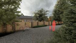 The facade of the house will be refracted white (warm tone – pearl white), the concrete or ceramic tile roof covering and metal sheeting elements will be black anthracite, the wooden lining, the fillings of external openings will be black anthracite. The fencing will be made of green plastic-coated mesh. The paved areas consist of a wooden WPC terrace and walking areas of split stone paving, the parking spaces will be made of grass blocks.