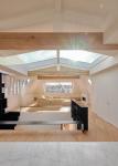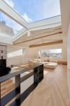 The creative team shapes two levels and conjoins them with the architectural set of stairs giving several uses to a transitional space, such as a screening projection stand, or a reading and workspace area. The top floor arranges common living functions assembling a minimal fireplace and a modular sofa that stands in front of a large wooden bench and under the panoramic window. The off-white ceiling exposes three solid wooden beams that reveal the structural order of the roof. The lower volume accommodates three private rooms with a master bedroom and bathroom applying marble and wood throughout.