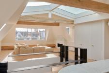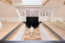 All furnishings of the penthouse apartment are custom-made and fitted into the space organizing the structure and internal zones. The central amphitheater expands between the two floors of the residence as a wooden staircase while two long steel platforms wrap around it in continuation to the prominent geometric bookcase that stands at the top of the steps. The skylight spreads light throughout the entire interior and forms an open visual passage through the volume.