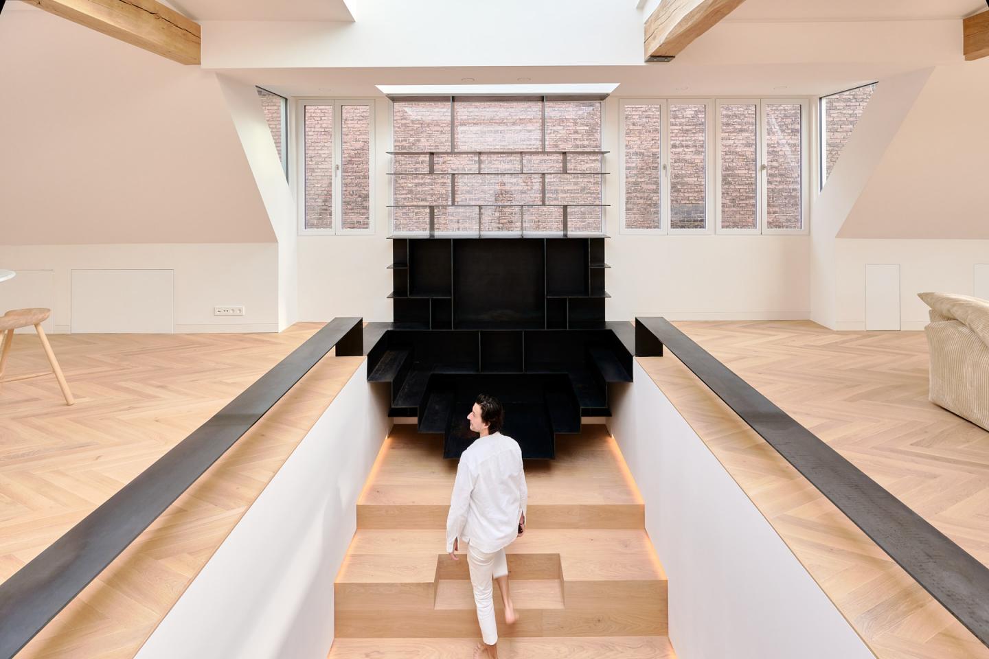 International architectural office zU-studio designs ‘Nº1 private residence‘, a contemporary penthouse located in one of Amsterdam‘s most well-known streets, Vondelstraat. The conception of the interior arrangement follows the studio’s unique spatial perception offering a variety of sequences, and visual relations. Several structural elements define the space providing for individual and collective living functions. Noble and robust materials construct custom fittings throughout the interior, such as the central geometric amphitheater made of wood, and the conjoined bookshelf-staircase and bench-like seating area made of steel. The centerpiece framework sits under a large skylight benefitting from natural light while connecting all zones and levels of the residence retaining both visual continuity and circulation.