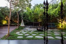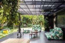 To create a hospitable environment for guests and family, this home is furnished with tropical fabric sofas that sit under a black iron pergola in the style of a Berlin club, with a back wall cladding in the same style finish. The play between the softness of the fabric and the stiffness of the iron, the straight line in front of the winding leaves, creates a contrast that reinforces each of the styles. Next to these is a spectacularly designed stainless steel outdoor kitchen, next to which is a solid wood dining table that overlooks the mix of materials of wood, iron, grass and stone walkways that define different areas in the open space.