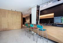 Following this comes the kitchen, which together with the living room creates an open space and contributes to the illusion of openness. The floating island in oak veneer has been designed on angles throughout all planes, with the light fixture above it accompanying the challenging shapes. It is covered with a black surface that returns in the high front from black wood in a diagonal application. A constructive pillar covered with plaster emerges from it, on which the owner's collection of knives for easy accessibility and decoration. The colorful chairs around it are authentically industrial, as they are made from parts of the car industry that have been masterfully and tastefully converted into furniture.