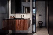 Next to the suite are the guest toilets that add to the atmosphere of a nightclub thanks to a black combed stone cladding, a hanging iron mesh and a brass faucet descending from the ceiling.