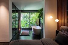 A secret door in the wood panelling leads you into the master suite, allowing you to disconnect from the outside world. It is equipped for a tailor made and ultra-pampering TV setup in the the ceiling, a transparent walk-in closet, and a free-standing bath above which indoor flora emerges from a black tin cladding that maintains a dialogue with the outdoor garden. The cladding of the back of a wooden bed with elongated slats is repeated in its pattern in the sink cabinet, and next to it is a mirror door that also serves as a body mirror and elegantly hides the toilet.