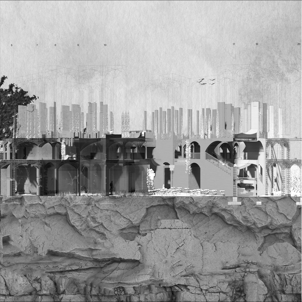 The project is located in the vestiges of Armero, Colombia, a city brutally devastated by an avalanche caused by the eruption of Nevado del Ruiz. The ruins are a labyrinth of walls, arches, latticework, and voids that intertwine with nature. Armero has a history of overlapping strata; the architectural piece is one more layer. The project is a labyrinth that seeks to architect the forest and reinterpret the ruin and the old blocks, creating spaces for travel and reflection. In order to evoke the vestiges and create feelings, the arch was used, found in Armerite architecture. The arch evokes the past, becomes the element that makes the void visible, and allows us to remember what was once there. The accumulation of these pieces creates rhythms that weave connections between the different layers of memory as it recalls the past, interacts with the present, and provides a structure for the future. Likewise, the project fades towards the clearing to house the heterotopic event and vertically to settle the following strata. In the middle of the labyrinth are pristine interior gardens for an intimate space and disconnection from the chaos that surrounds it. In the conjuncture stratum, there are vertical gardens that create atransition to the last stratum. Finally, the layer of life creates a garden in movement that grows freely and supports the current natural ecosystem. Finally, the accumulation of the pieces aims to reconcile memory by creating a space to honor the void left by violence.