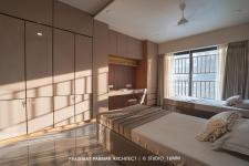 The home is a picture of serenity, with walls left in a neutral white by adding minimal texture and furniture made of veneer, with PU accents. The Door of the Guest bedroom is tactfully hidden by camouflaging it with the walls in vestibule which gives a lengthier and continues look to the vestibule.