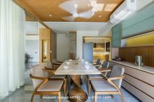 The living room has a minimalist design scheme like the rest of the house with wooden fluted panel ceiling, seamlessly running towards dining area. It is connected with the balcony to keep the user connected with nature which also fetches the natural light and air within. The relwood panels in this room, breaks the continuity of the ceiling. Whereas The MCM Cladding in the backdrop of Grey Colored Leather Sofa is highlighting element of the room.