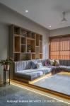 The quality that natural light adds to the Family area, creating an animated interplay of light and shadow lend a dynamic feel to this much-used space. The family room becomes a cozy place in the apartment as it is provided with Indian Low Height Sitting in a Curved Shape that reflects the charisma of the space.
