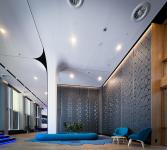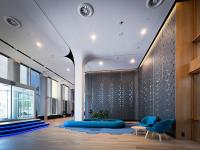 The figures engraved on the walls of the TMN Lobby are inspired by the coral reef, letting out a soft and indirect blue light that gives life to the space while revealing itself as a skin that breathes.
