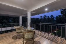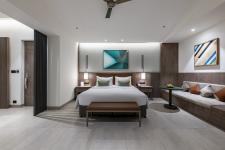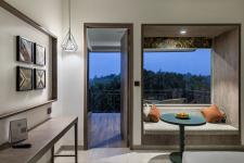 The rooms followed a contemporary style, with the balcony serving as a significant part of the space, complimenting both aesthetics and functionality. The balcony unveils a beautiful view of the surroundings while contributing to providing natural cross ventilation. The artwork in the rooms resonates with the local art of Goa, in which blue lines represent the beach and wooden strips imitate the dunes, twisted with contemporary elements rendering a rustic feel to the space.