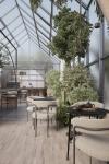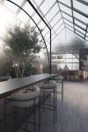 The presence of plants in the greenhouse in combination with frosted glass creates an incredible illusion of the absence of matter and maximum unification with nature.