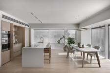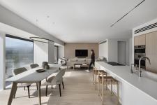 The first space that can be seen upon entry to the property is the kitchen and the dining area. The kitchen was designed with two concept doors that open up and when they are closed, hide a worktop equipped with a range of kitchen utensils and appliances. This was planned in line with the minimalist theme, allowing the owners to conceal the items when these are not in use.