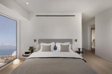 The master bedroom overlooks the beautiful garden and is also home to Zohar Yosefian’s artwork “A Dahlia in three colors” - a 3D piece that changes color depending on the angle.