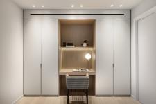The safe room was converted into a walk-in wardrobe with a home office corner at the end of it. A funky shoe bench was fitted in the wardrobe creating additional storage space.