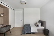 The guest bathroom is used as the main bathroom, and is fitted with a minimalist shower, and a cupboard in a similar shade to the floor, that keeps the space tidy. Thin 2.8 X 1.2 meters tiles were used for the walls, creating a clean space, and the mirrors were fitted with led lighting.