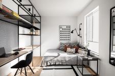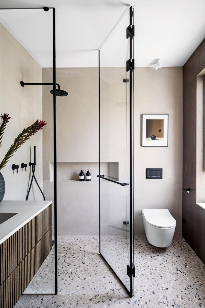 The older son’s room was fitted with a black steel library with a built-in study corner and a barn style wardrobe unit. Natural colors and terrazzo flooring were used in the boys’ shared bathroom that is combined with a laundry room.