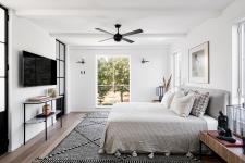 The parents' room was spruced up with the help of wooden ceiling beams, a white wardrobe corner that makes the space appear bigger, an abundance of textiles that provide a sense of warmth, and a Belgian steel profile doorway that leads to a wood and terrazzo en-suite.