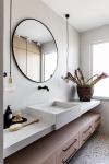 The guest toilets, which were completely redone and include a free-standing sink, are located behind an integral door adjacent to the lounge. The lower part of the wall is cladded with gray terrazzo and the top part with wood.