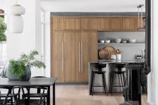 The kitchen, which is the heart of the house, was changed considerably. The owners wanted it to be cozier and have an industrial vibe to it. It was important to them that the furniture would be light, the openings would be floor-to-ceiling ones and that the old planning qualities would be kept but made more current and adapted to today’s standards. As a result, a large kitchen with clean straight lines and contrasting materials was designed. A stone wall cladding acts as a strong yet graceful backdrop for the wooden cupboards and matches the space with its shades of light-brown and gray.