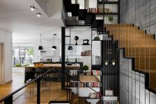 In addition, a huge library was designed to accompany the entire height of the house, approximately 10.5 meters in length. When the library on each floor is used by the tenants for different needs - in the basement for the children, the entrance is used to store a cooking library with decorative books and upstairs as a leisure library.