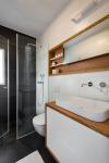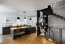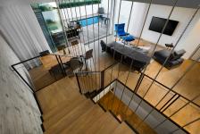 The entrance floor is designed with a large open area, located alongside the garden area and entrance, creating a sense of wide-open space. The only walled area is a long 2 family wall without openings. This element was utilized to create a large exposed concrete wall that accompanies the entire length of the house and staircase, which is a central design element. The vertical axis that connects all floors, from the basement to the top floor. It is a dominant and significant wall that gives depth to the home and will be a wonderful backdrop for stairs. The staircase is made of 12 mm thick tin, with oak paneling, which looks like the wood is "swallowed" in metal. Its central railing is made of stainless-steel strings.