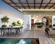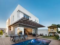 The living room has a central and dominant sofa with a backrest that allows you to lie down, host, sit and chill, and beside it an arm chair and footstool so that the sitting is informal, but family orientated. The living room has a pool and garden exit. The pool has been designed with a raised cover to close the pool for safety when it is not in use, a seating area for entertaining guests, and a tree house adding a decorative atmosphere while making a great play area for children.