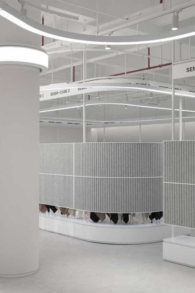 Semir Materials Creative Center is located on the 2nd floor in NO.2 Building of the 2nd Phase of Semir Industry Park, so it’s named “CUBE2”. As a leading brand of Chinese leisure garments, Semir has been continuously selected as the Top 500 Chinese private-owned enterprise for several years. For further development, the client wanted to renovate the material center into a more inspiring place integrated with display, creative work, and runway shows for their designers.