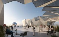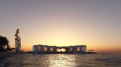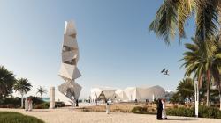 A bold sightseeing tower rises from the horizon line which is formed by a park’s palm trees signalling the position of the Tourism Activation Centre at Yanbu’s coast. As visitors weave through the park, the centre begins to reveal itself through its landscape design, sculptural seating and architecture lead visitors to the tower and the nearby building entrance.