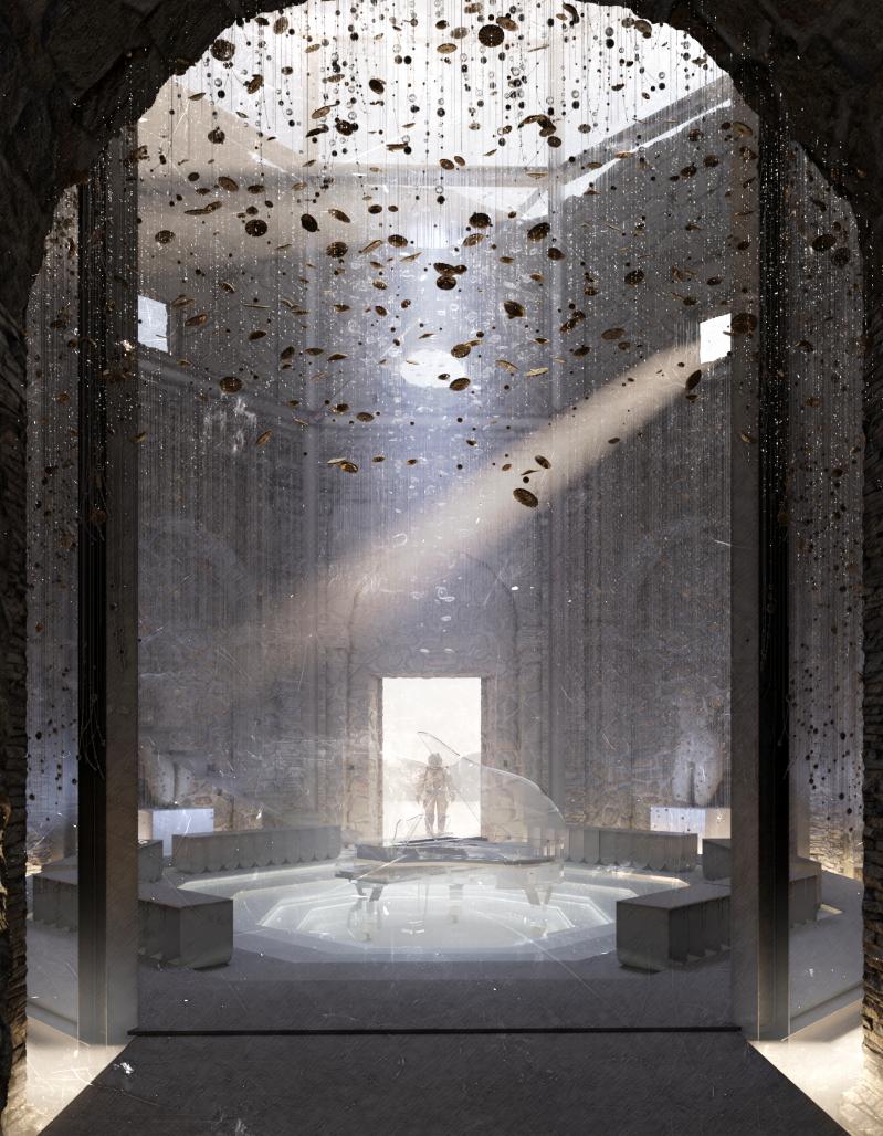 The inner space of the church has a smooth descent to the center of the tower for the passage and listening to concerts. The main idea of the interior design of the chapel is to create the illusion of dissolving in space-time. Thin threads with teardrop-shaped metal and glass pendants hang from the walls and internal support structures of the tower, framing the entire space. Due to the reflection and light transmission of the material of the pendants, the viewer creates a feeling of subtle uncertainty, which isolates the person from the outside world, and allows him to fully focus on his thoughts and feelings.