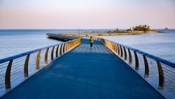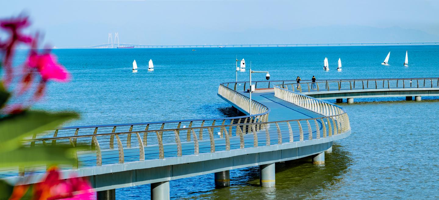 Surrounded by the bay, citizens and tourists stop at the landscape plank road to view the mountain, the city and the sea 360 degrees in the center of the plank road, and have a panoramic view of the Haitian Posthouse, Haitian Park, Xiangshan Cloud Road, Zhuhai Planning Exhibition Hall, Zhuhai Opera House, Hong Kong Zhuhai Macao Bridge and other landscape landmarks.
